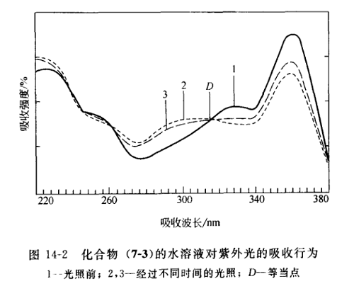 含乙烯結(jié)構(gòu)的熒光增白劑存在順?lè)串悩?gòu)現(xiàn)象,一般在正常情況下它們呈反式構(gòu)造,但是曝露在紫外光或日光下有可能轉(zhuǎn)變?yōu)轫樖綐?gòu)型。這種變化會(huì)干擾上述分析的準(zhǔn)確度,因此對(duì)這類物質(zhì)的分析較好在避光的條件下進(jìn)行。有些此類熒光增白劑的順?lè)串悩?gòu)現(xiàn)象有一個(gè)等當(dāng)點(diǎn),見圖14-2所示的吸收曲線。