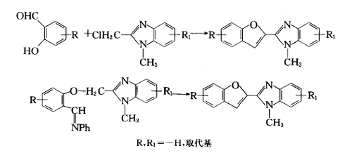 如先合成2-氯甲基苯并咪唑,再引人苯并呋喃端基,可讓該氯甲基化合物與水楊醛縮合環(huán)化;或經(jīng)由相應(yīng)的席夫堿進(jìn)行環(huán)化,形成一個(gè)連續(xù)的共軛體系。如: